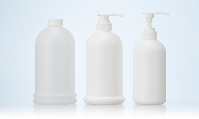 清潔感のある軽量容器で、主に理美容向けからあらゆる業界へと、幅広い用途にお使いいただけます。 キャップはパッキン付きのラックキャップと、ポンプ付きの2種をランナップ。